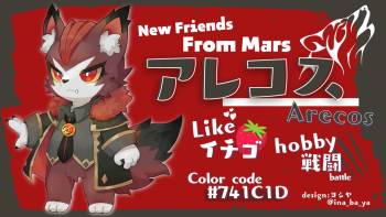 Arecos in this dimension comes in the form of a red wolf-like animal. He was retrieved from the planet Mars. He likes strawberries. His hobbies are fighting and battle. His hex color code is #741C1D. He was found on Mars by Apolleon and Pollneu. He is the third of the NefeloMakion crew counterpart animals to join Astel in this dimension.