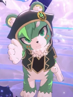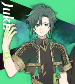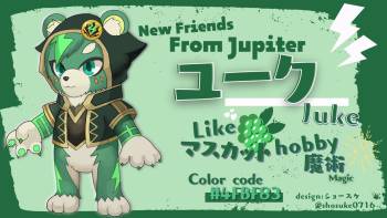 Juke in this dimension comes in the form of a light green bear-like animal. They were retrieved by Apolleon, Pollneu and Arecos from the planet Jupiter. Juke likes Muscat Grapes. Their hobby is magic. Their hex color code is #4FBF83. Juke is the fourth of the NefeloMakion crew counterpart animals to join Astel in this dimension.