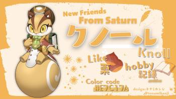 Knoll in this dimension comes in the form of a light brown squirrel-like animal. She came alone from the planet Saturn. She likes Chestnuts. Her hobby is archiving. Her hex color code is #E7C17A. She had something to tell Astel so she came alone from Saturn while the others were searching for Uratty and Stridon in Uranus and Neptune respectively. She is the fifth of the NefeloMakion crew counterpart animals to join Astel in this dimension.